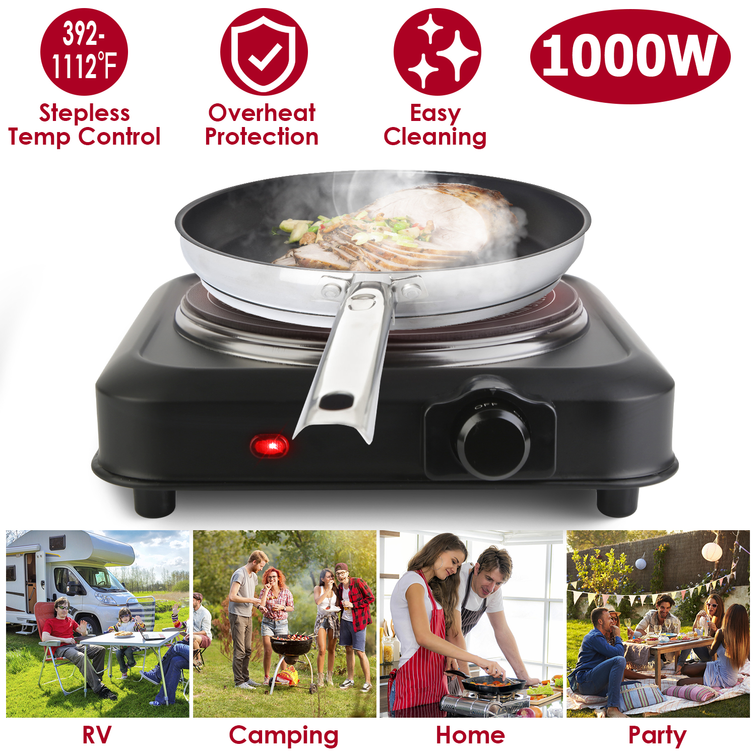 This compact infrared single burner is great for events and traveling! The lightweight and compact design allows for easy storage and carrying. The hot plate burner with special infrared technology distributes heat quickly and evenly for great performance at 392-1112℉stepless adjustable temperature. 7.5in-Diameter glass heating plate makes it suitable for most cookware with diameter≤7.5in, such as frying pans, woks or stovetop teapots made from aluminum, stainless steel, iron, glass, etc.. Perfect for camping, student accommodation, holiday homes, caravans, campers, offices or as an extra cooking surface in a busy kitchen. A sleek clean black finish adds style and a sleek appearance to this wonderful kitchen addition!