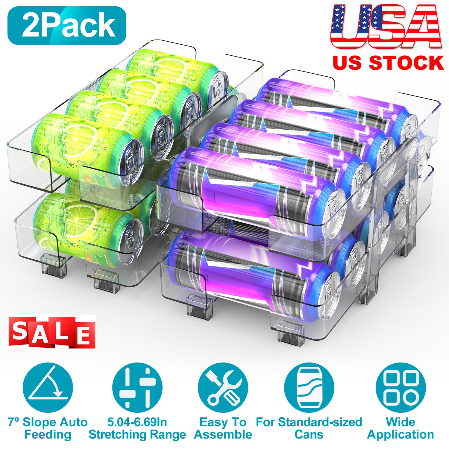 2Pack Adjustable Soda Can Organizers 2-Tier Pop Can Holders Beverage Dispensers For Fridge Pantry Cabinet 7º Slope Auto Rolling